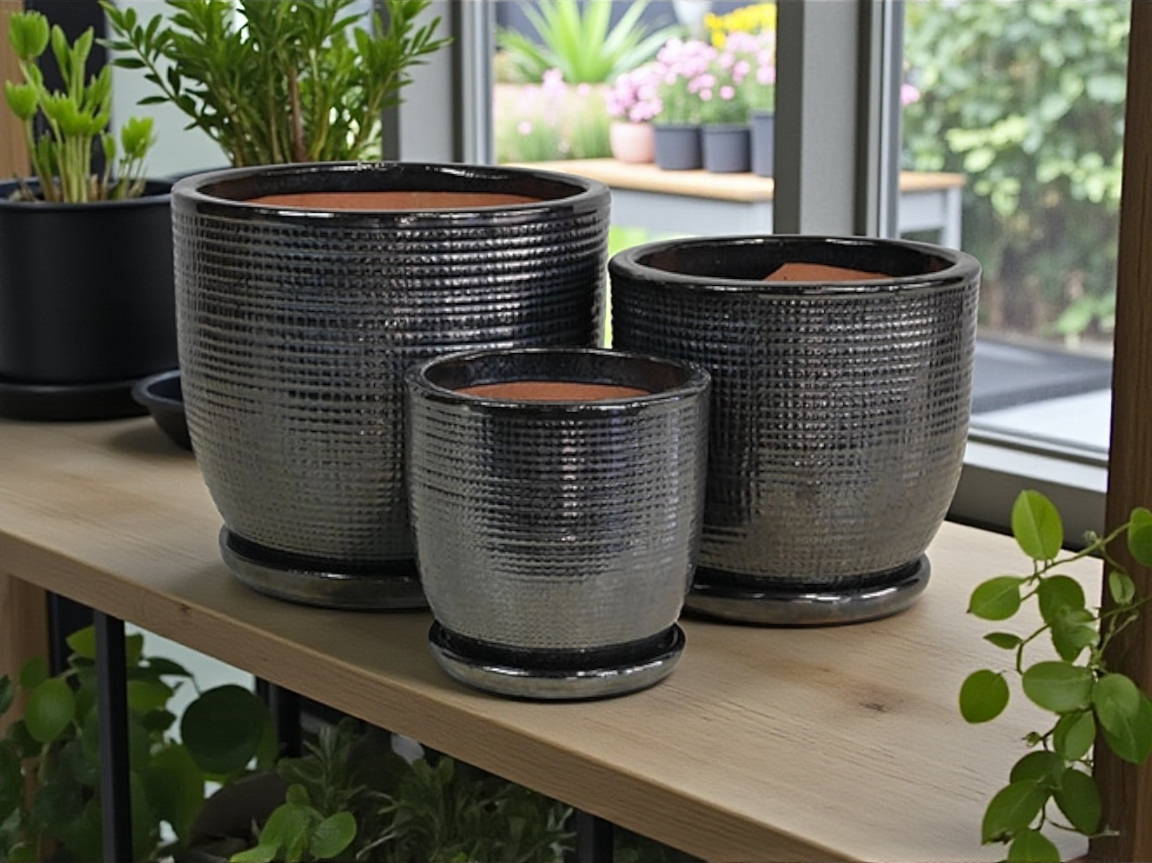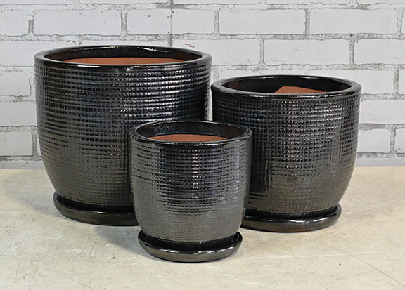 | GM025GP | Cleo Pot w/ Attached Saucer – Graphite – S/3 – 12″D x 11″H, 10″D x 9″H, 8″D x 7″H – 025734497537, 025734497544, 025734497551 |