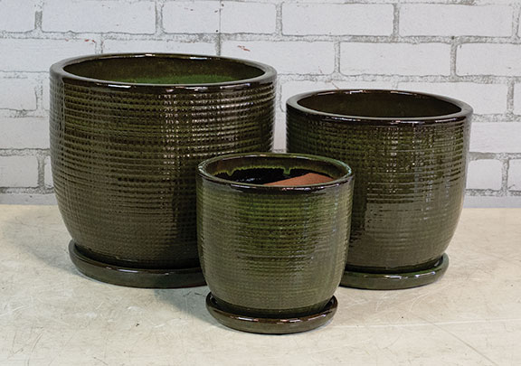 | GM025TG | Cleo Pot w/ Attached Saucer – Tropical Green – S/3 – 12″D x 11″H, 10″D x 9″H, 8″D x 7″H – 025734497537, 025734497544, 025734497551 |