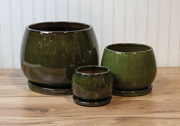 | GM002TG | Tondo Pot w/ Attached Saucer – Tropical Green – S/3 – 11″D x 9″H , 8″D x 7″H , 6″D x 5″H – 025734497360 , 025734497377 , 025734497384 |